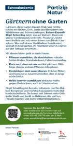 Info: Blüten, Kräuterduft und kleine Ernten passen auch auf wenige Quadratmeter. Birgit Schattling, Berliner Balkongärtnerin und „Natur im Garten“-Botschafterin, zeigt praxistaugliche Tipps für robuste Pflanzen, kluge Kombinationen und Tricks gegen Vertrocknen, auch in Urlaubszeiten. Dabei geht es um Ideen, die sofort weiterhelfen und ohne großen Aufwand funktionieren. Was auf einem Stadtbalkon in der Berliner Innenstadt klappt, gelingt im Hochbeet, im Kleingarten oder in Töpfen auf der Terrasse erst recht.
