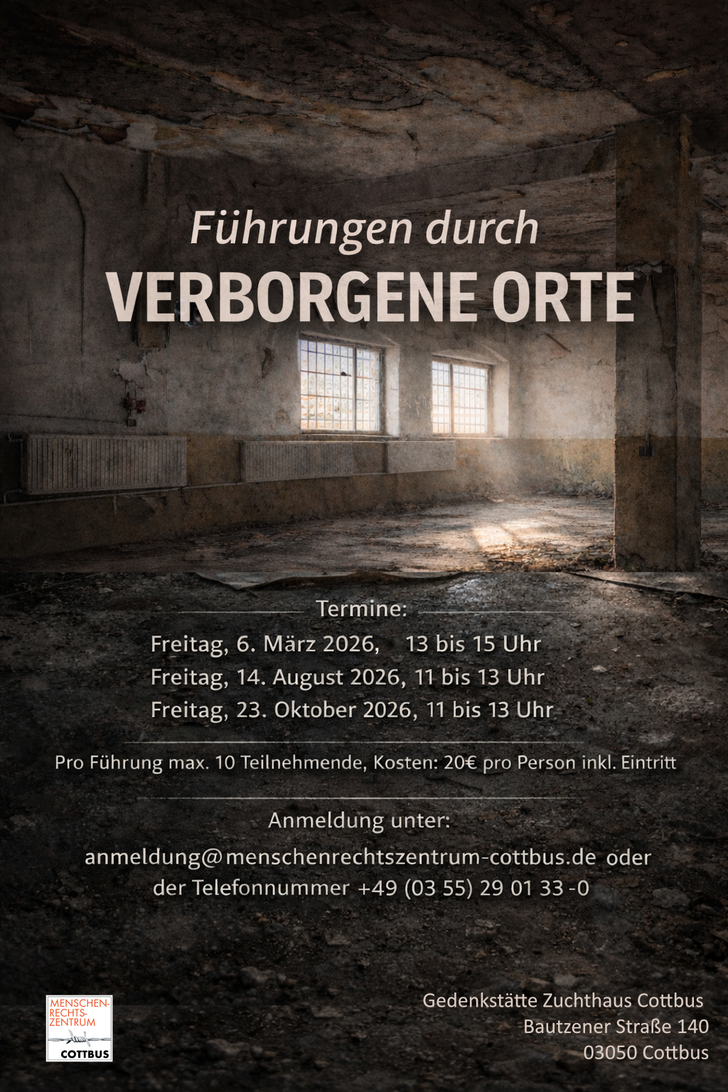 Begrenzte Plätze: Es können max. 10 Besucherinnen und Besucher teilnehmen. Anmeldung bis zum 22. Oktober 2026 unter anmeldung@menschenrechtszentrum-cottbus.de oder der Telefonnummer +49 (03 55) 29 01 33 – 0.