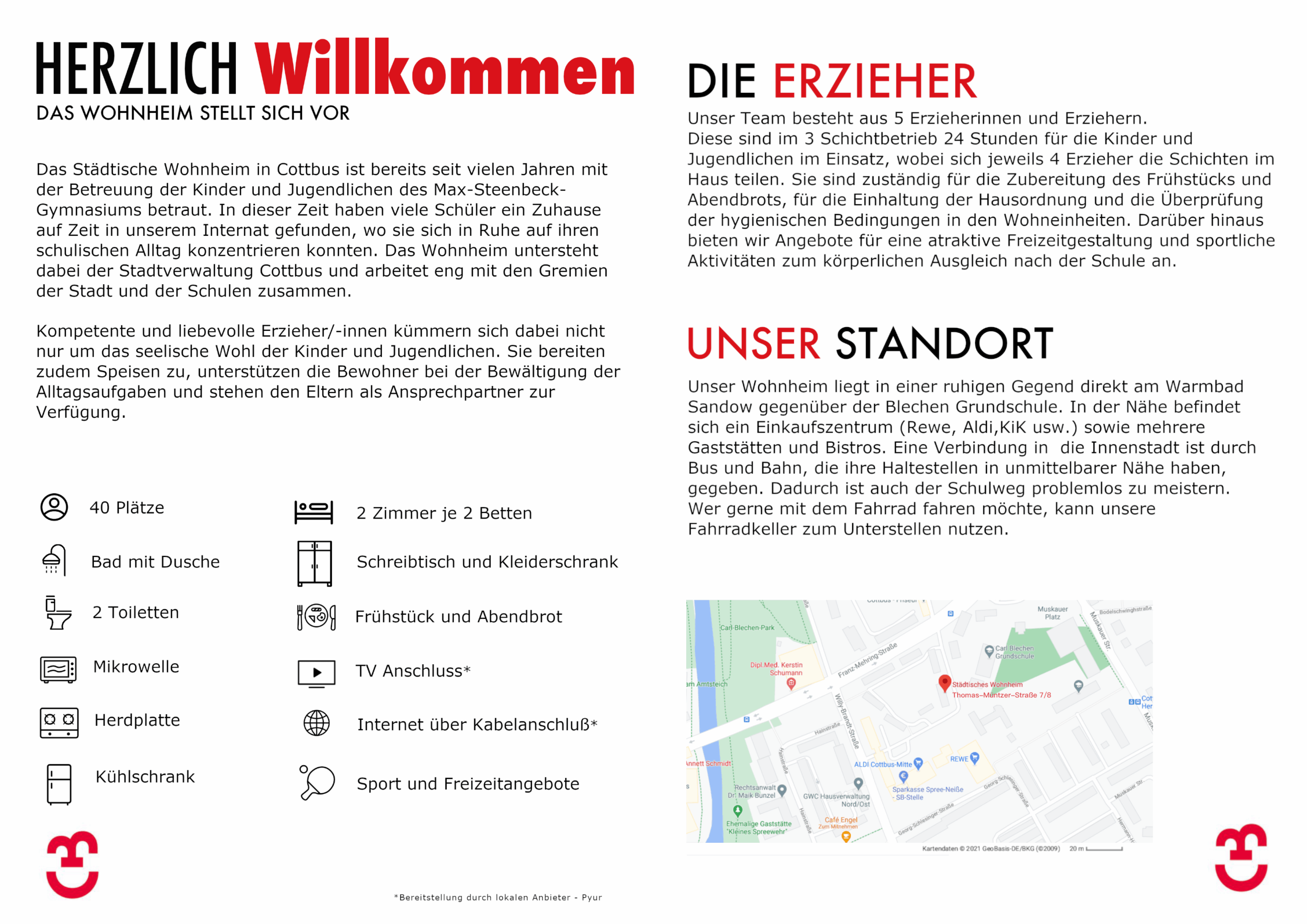 Das Städtische Wohnheim in Cottbus/Chóśebuz ist bereits seit vielen Jahren mit der Betreuung der Kinder und Jugendlichen des Max-Steenbeck-Gymnasiums betraut. In dieser Zeit haben viele Schüler ein Zuhause auf Zeit in unserem Wohnheim gefunden, wo sie sich in Ruhe auf ihren schulischen Alltag konzentrieren konnten. Das Wohnheim untersteht dabei der Stadtverwaltung Cottbus und arbeitet eng mit den Gremien der Stadt und der Schulen zusammen.