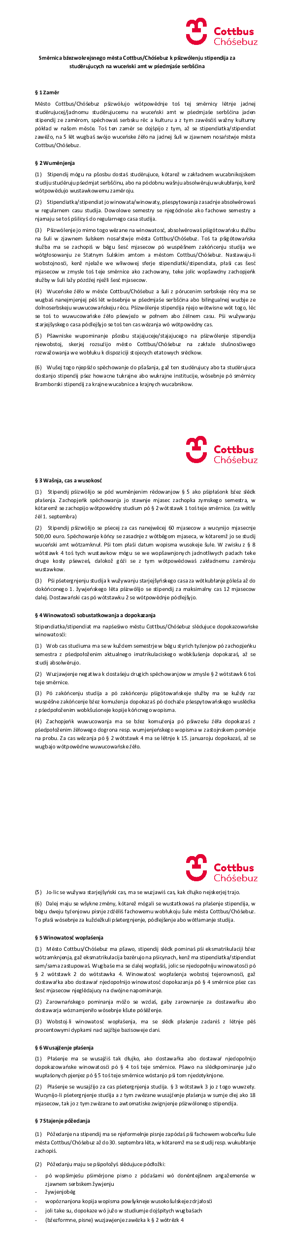 Richtlinie der kreisfreien Stadt Cottbus/Chóśebuz zur Gewährung eines Stipendiums für Lehramtsstudierende im Fach Sorbisch/Wendisch vom 16.07.2025