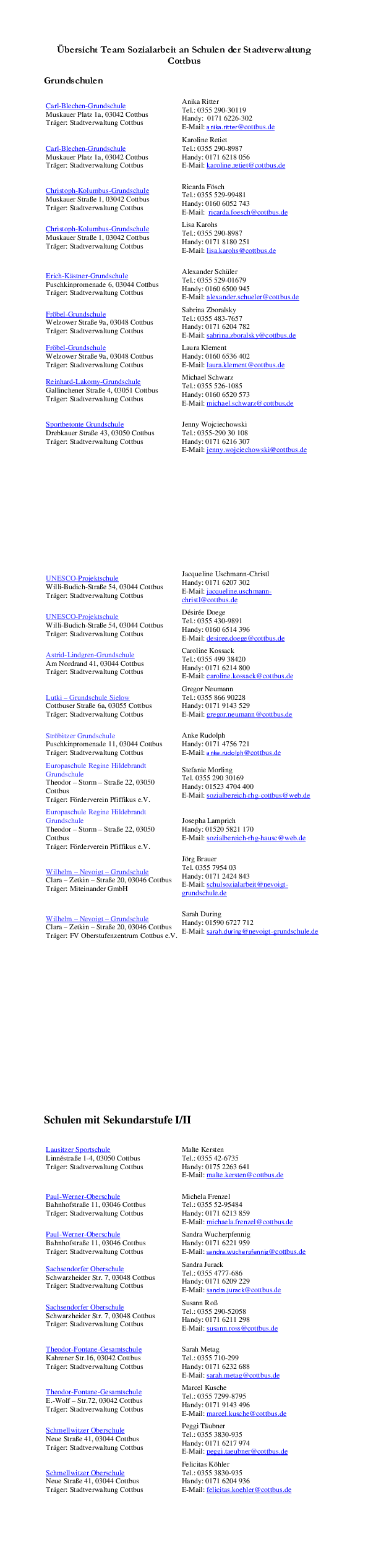 | Reinhard-Lakomy-Grundschule Gallinchener Straße 4, 03051 Cottbus Träger: Stadtverwaltung Cottbus | Michael Schwarz Tel.: 0355 526-1085 Handy: 0160 6520 573 E-Mail: michael.schwarz@cottbus.de |
