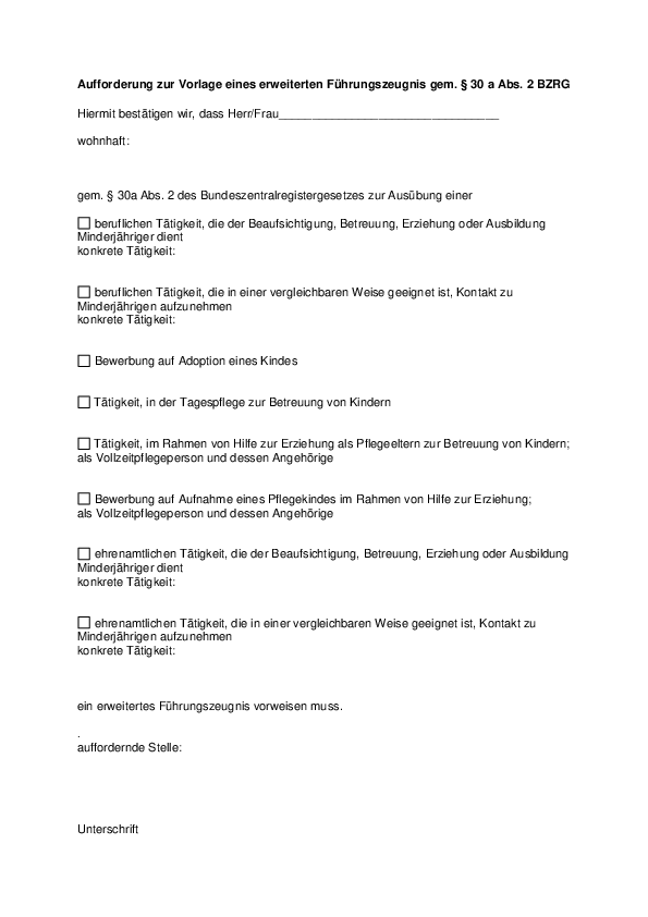 Die Person, die ein erweitertes Führungszeugnis beantragt, muss eine Aufforderung vorlegen, in der die Person, die das erweiterte Führungszeugnis vom Antragsteller verlangt, bestätigt, dass das erweiterte Führungszeugnis benötigt wird für die Prüfung der persönlichen Eignung nach § 72 a oder weil der Antragsteller eine berufliche oder ehrenamtliche Tätigkeit ausübt/aufnehmen will, die der Beaufsichtigung, Betreuung , Erziehung oder Ausbildung Minderjähriger dient, bzw. eine vergleichbare Tätigkeit ausübt/aufnehmen will, die geeignet ist, Kontakt mit Minderjährigen aufzunehmen.