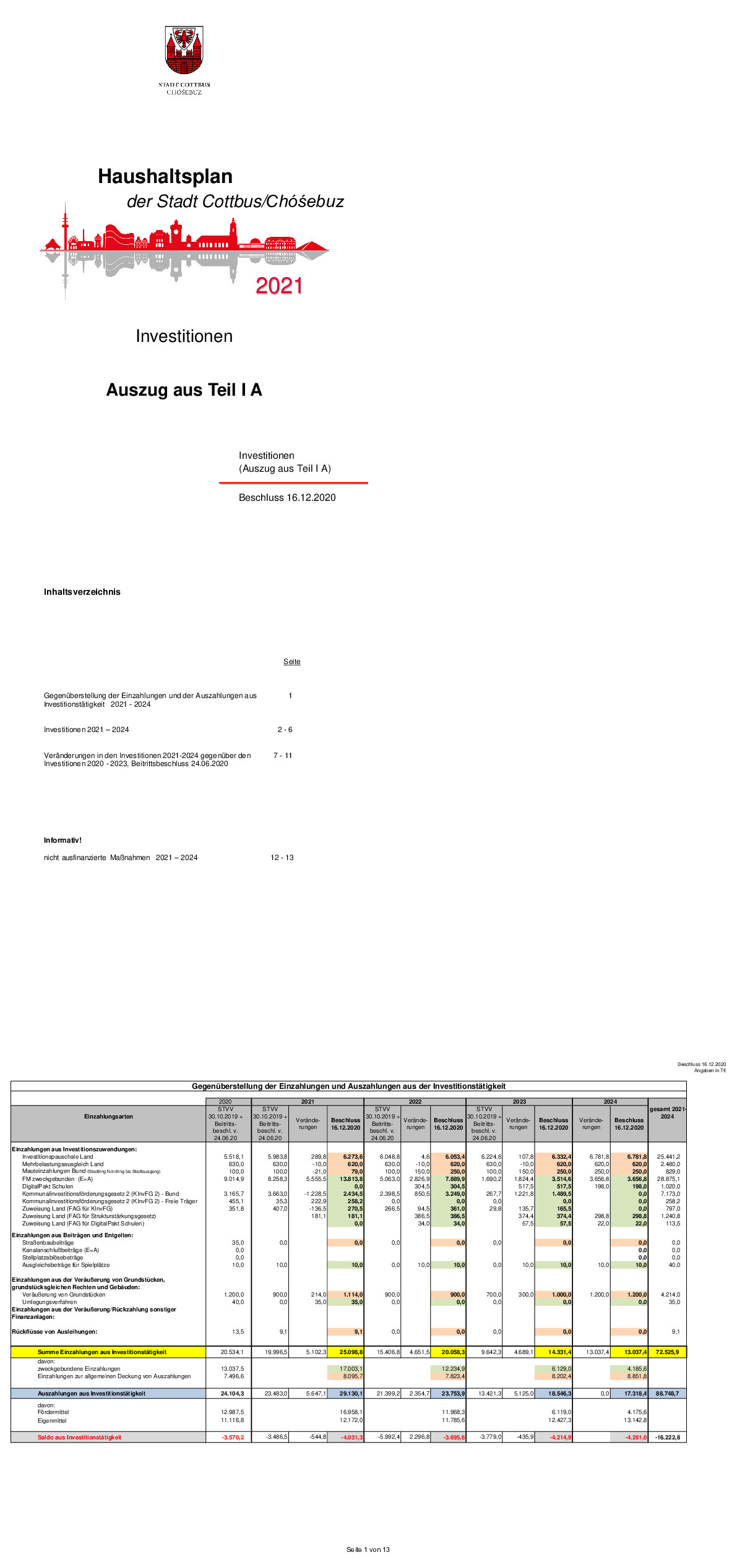 Haushalt der Stadt Cottbus/Chóśebuz für das Jahr 2021