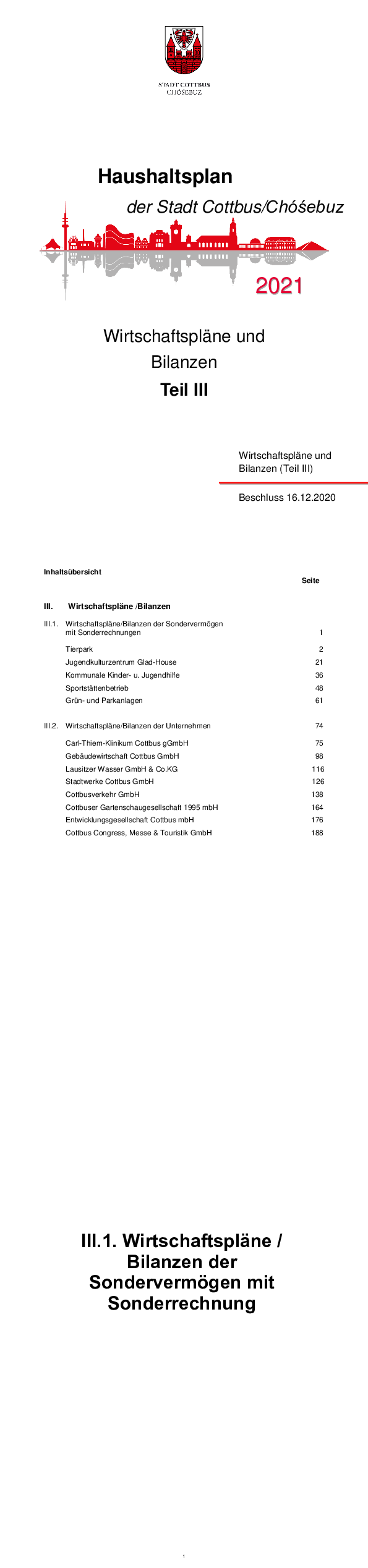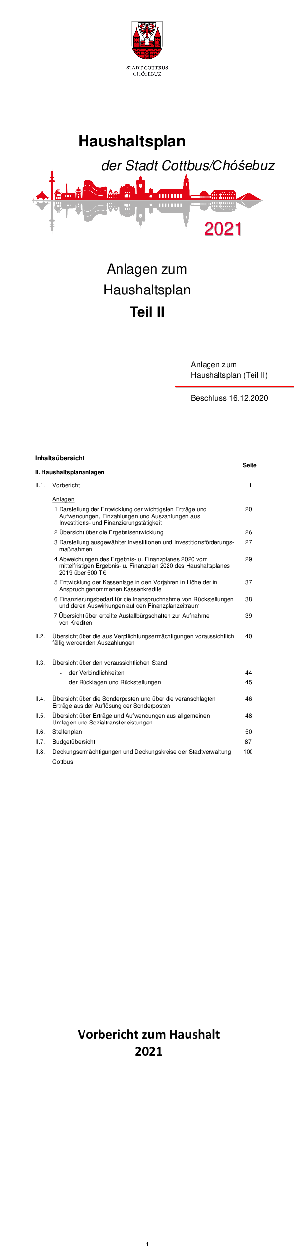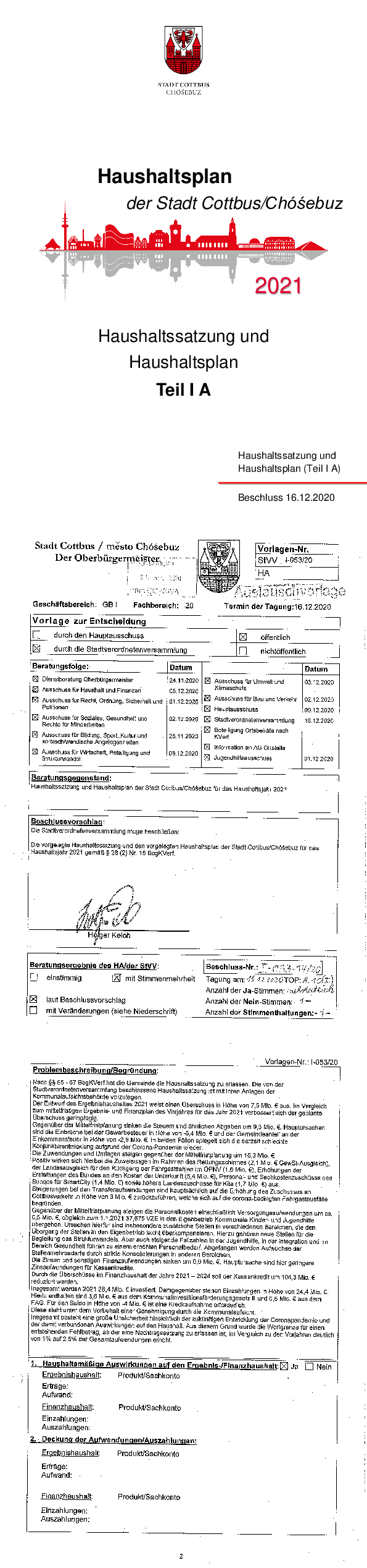 Haushaltssatzung und Haushaltsplan der Stadt Cottbus für das Haushaltsjahr 2021