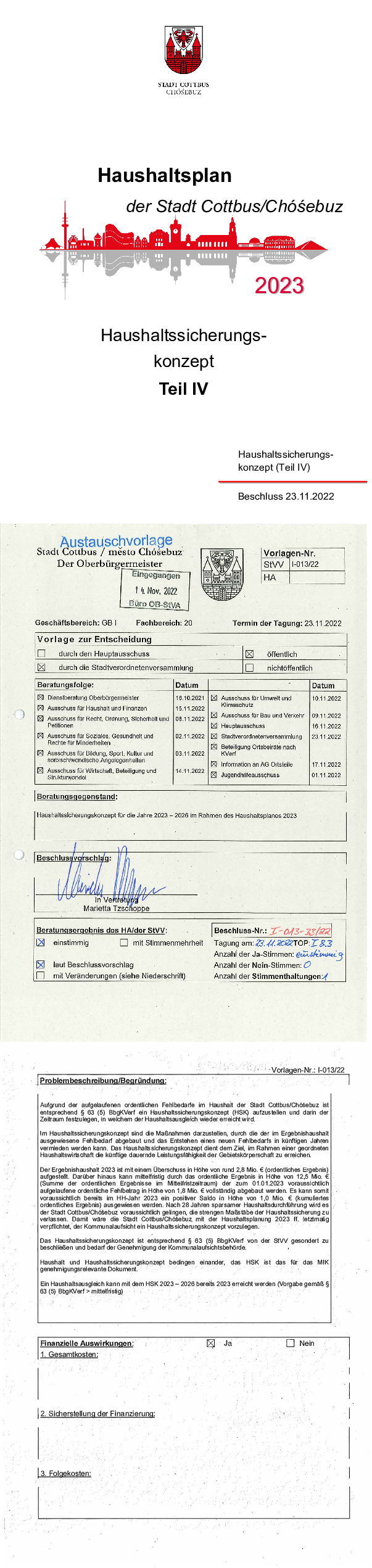 In der Stadtverordnetenversammlung am 23. November 2022 wurde folgendes Haushaltssicherungskonzept der Stadt Cottbus/Chóśebuz für das Jahr 2023 beschlossen.