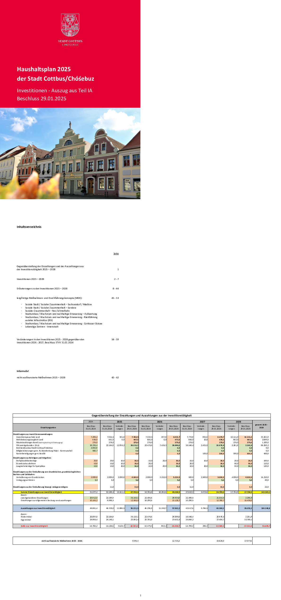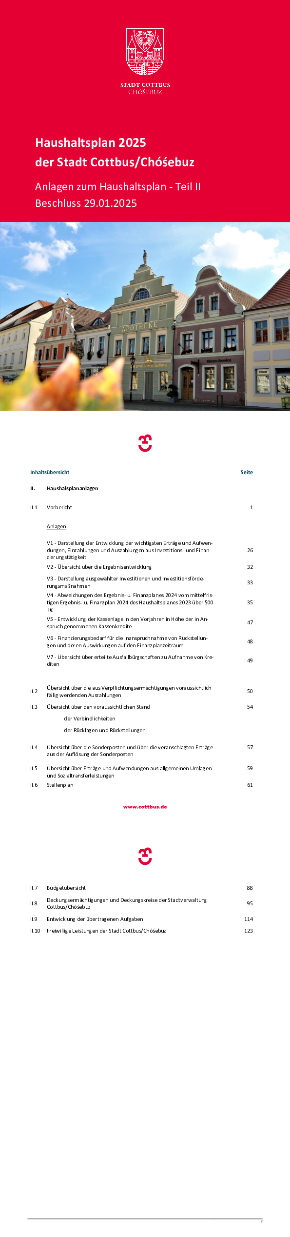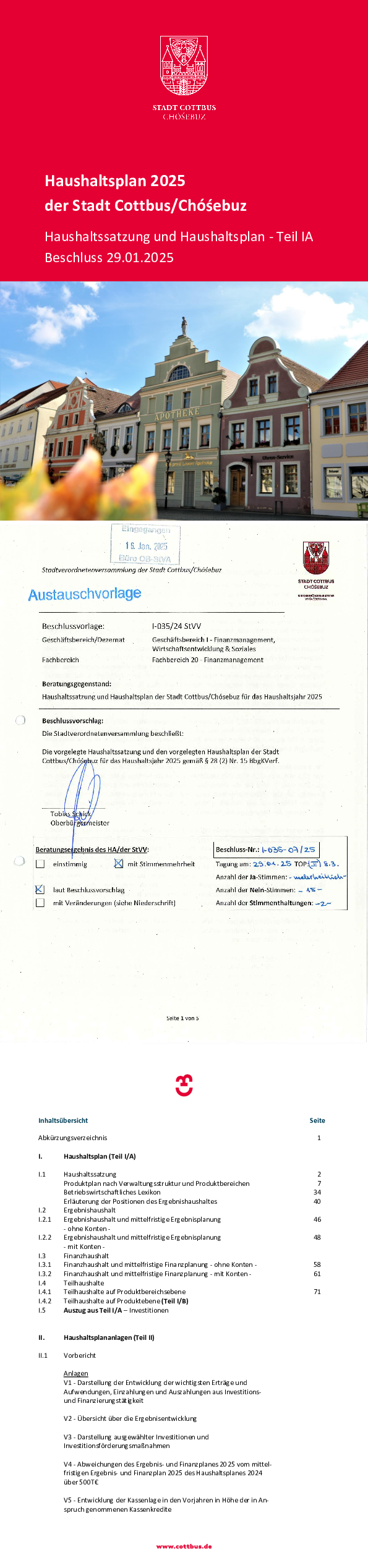 In der Stadtverordnetenversammlung am 29. Januar 2025 wurde die folgender Haushaltssatzung und der folgende Haushaltsplan der Stadt Cottbus/Chóśebuz für das Jahr 2025 beschlossen.