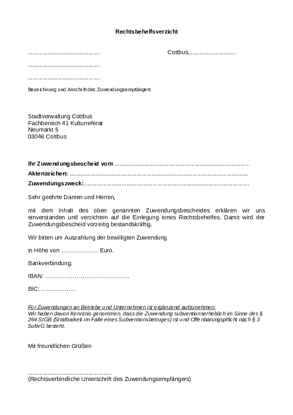 Rechtsbehelfsverzicht - Kulturförderreichtlinie der Sadt Cottbus Chóśebuz