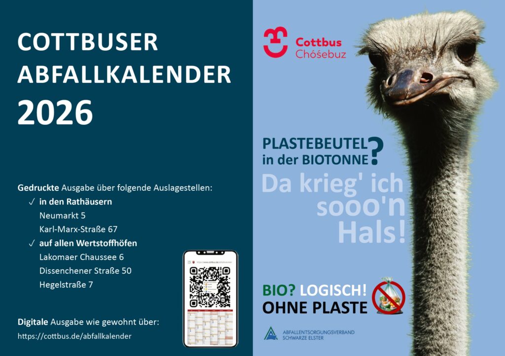 Seit 19.12.2025 liegt die Druckbroschüre des Cottbuser Abfallkalenders 2026 wieder als Abholvariante an beiden Rathäusern und allen Wertstoffhöfen aus. Auf eine Briefkastenzustellung wurde zum Wohle der Umwelt zum 4. Mal in Folge verzichtet.