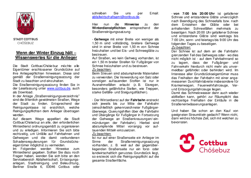 Mit der Straßenreinigungssatzung und der Straßenreinigungsgebührensatzung wird, sofern die Stadt Cottbus/Chóśebuz die Leistungen der Straßenreinigung nicht gebührenpflichtig realisiert, die Pflicht zur Straßenreinigung dem Eigentümer bzw. Anlieger übertragen. Obliegt die Reinigungspflicht dem Anlieger sind durch ihn, nach Beendigung der Reinigungsarbeiten, Kehricht und sonstige Abfälle unverzüglich, nach Maßgabe der Abfallentsorgungssatzung, zu entsorgen. Lesefassung_Strassenreinigungssatzung_2025.pdf