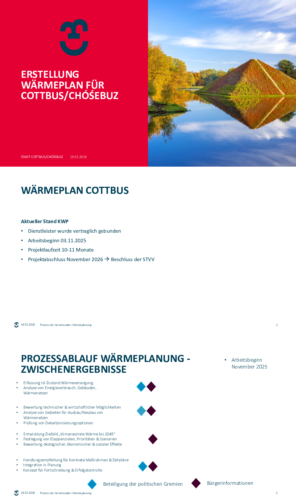Laut Wärmeplanungsgesetz (WPG) müssen Kommunen mit mehr als 100.000 Einwohnern bis zum 30. Juni 2026 einen Wärmeplan erstellt haben. Kommunen mit weniger als 100.000 Einwohnern haben bis zum 30. Juni 2028 Zeit. In Cottbus hätten wir also bis Mitte 2028 Zeit die KWP zu erstellen. Wir wollen Ihnen als Bürgerinnen und Bürger und Unternehmen aber so schnell wie möglich Planungssicherheit verschaffen. Darum haben wir vor bis September 2026 die KWP für Cottbus abzuschließen.