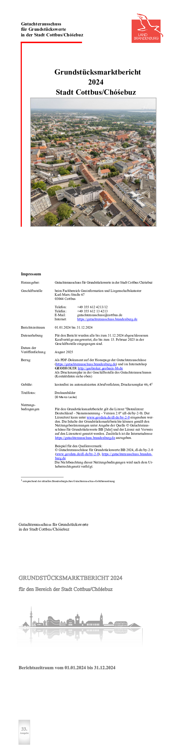 Der Gutachterausschuss für Grundstückswerte in der Stadt Cottbus/Chóśebuz hat den Grundstücksmarkt der kreisfreien Stadt Cottbus/Chóśebuz auf der Grundlage der eingegangenen Kaufverträge analysiert und den Grundstücksmarktbericht aus den Daten des Geschäftsjahres 2024 erarbeitet, beraten und bestätigt. Dieser ist eine aktuelle und detaillierte Informationsquelle für Sachverständige der Grundstückswertermittlung für bebaute und unbebaute Grundstücke, Steuerberater, Makler, Banken und andere Institutionen sowie die interessierte Bürgerschaft.