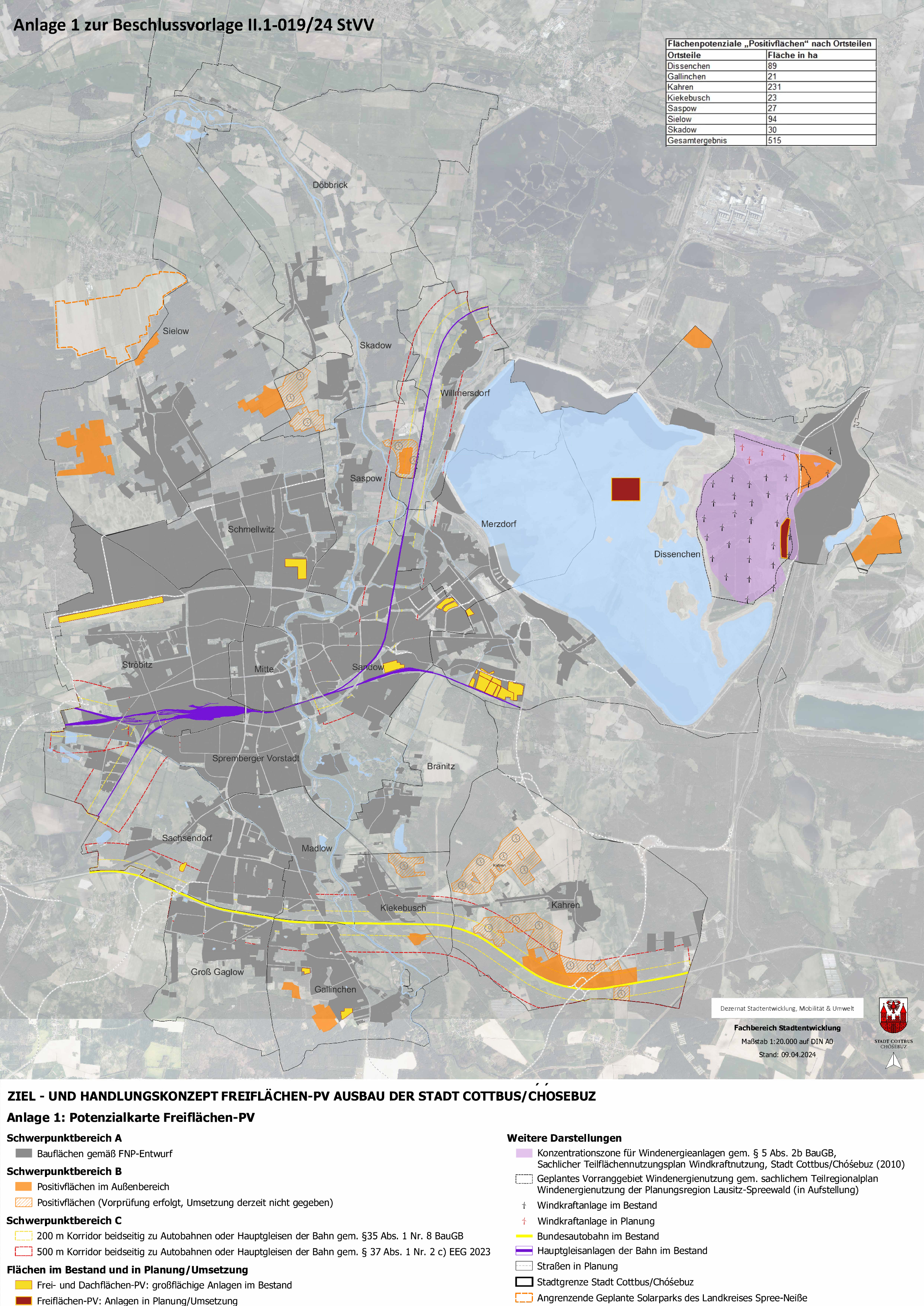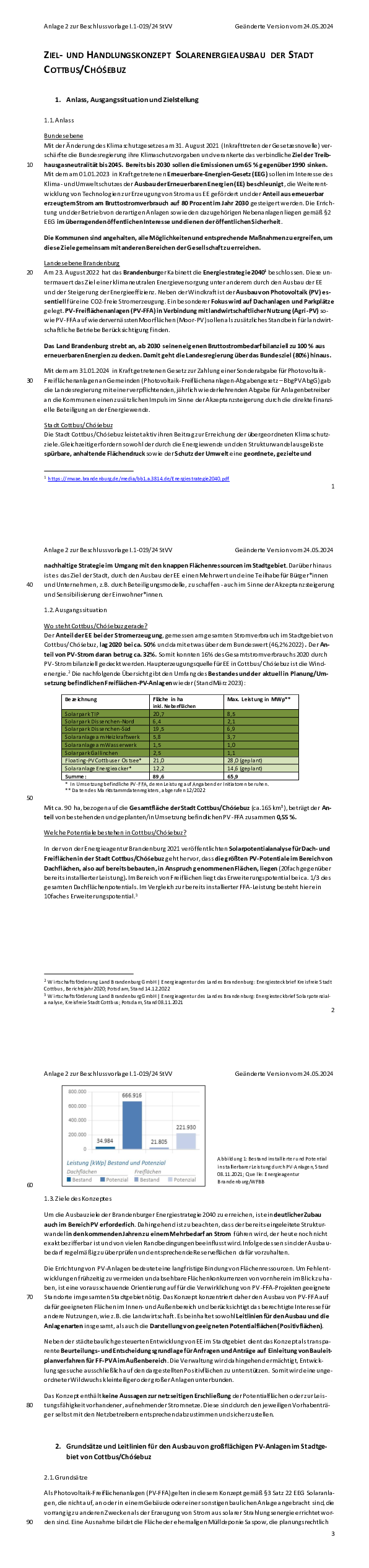 Die Stadtverordnetenversammlung hat am 29. Mai 2024 ein Ziel- und Handlungskonzept zur Steuerung der Entwicklung von großflächigen Photovoltaikanlagen auf dem Gebiet der Stadt Cottbus/Chóśebuz beschlossen. Das Konzept stellt eine Handlungsgrundlage für die Verwaltung bei der Beurteilung von Anfragen und Einleitung von Planungs- und Genehmigungsverfahren im Sinne einer transparenten Steuerung des Ausbaus großflächiger Photovoltaikanlagen dar.