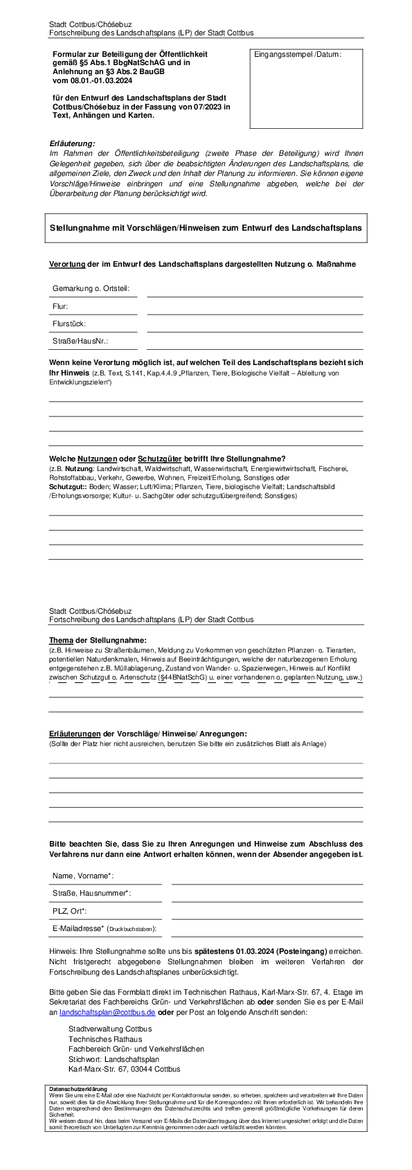 Während der Veröffentlichungsfrist können Stellungnahmen abgegeben werden. Diese sind bis einschließlich 01.03.2024 elektronisch über www.cottbus.de/landschaftsplan einzureichen oder via E-Mail an landschaftsplan@cottbus.de zu richten. Außerdem können Stellungnahmen schriftlich an folgende Adresse versendet werden:
