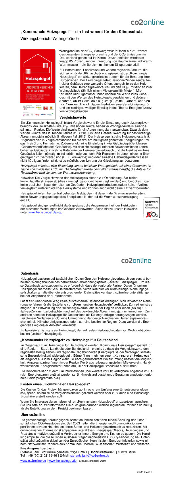 Der Heizspiegel für Deutschland ( www.heizspiegel.de ) ist ein Projekt von co2online, unterstützt durch „Mein Klimaschutz“ im Auftrag des Bundesumweltministeriums. Er entsteht in Kooperation mit dem Deutschen Mieterbund e. V. und wird seit 2005 jedes Jahr von co2online realisiert.