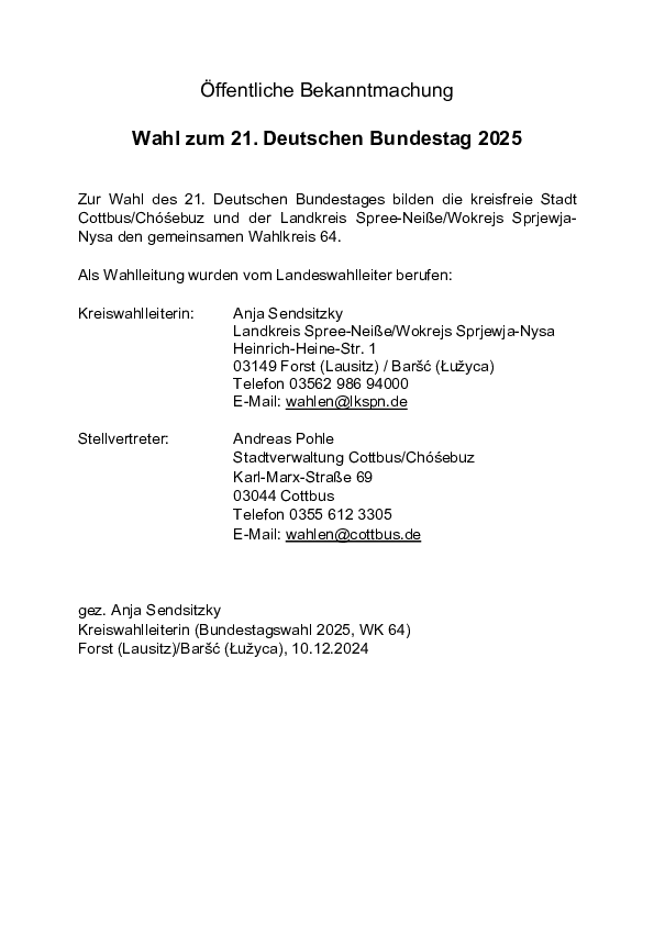 Zur Wahl des 21. Deutschen Bundestages bilden die kreisfreie Stadt Cottbus/Chóśebuz und der Landkreis Spree-Neiße/Wokrejs Sprjewja-Nysa den gemeinsamen Wahlkreis 64.