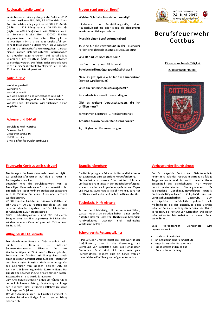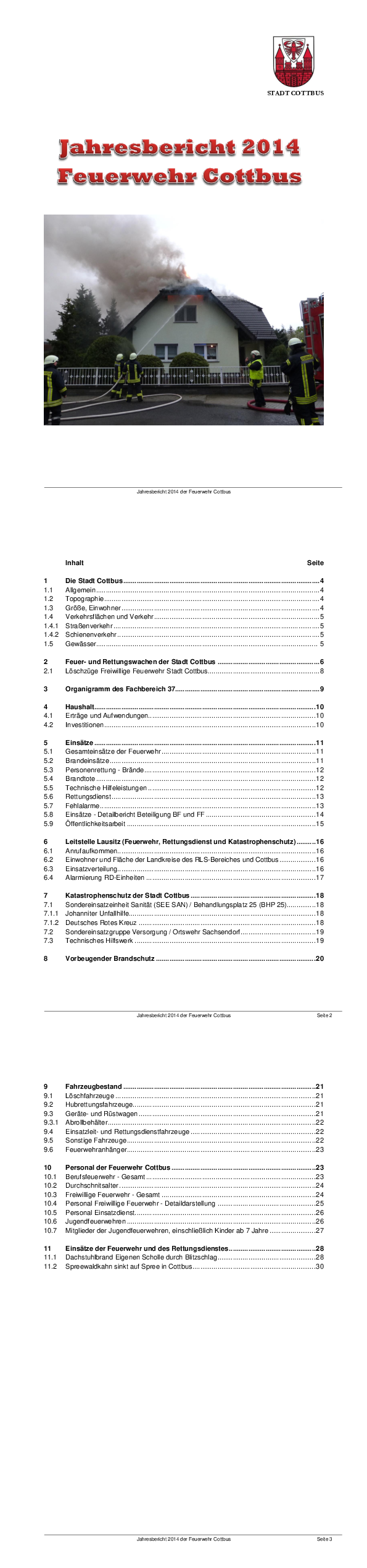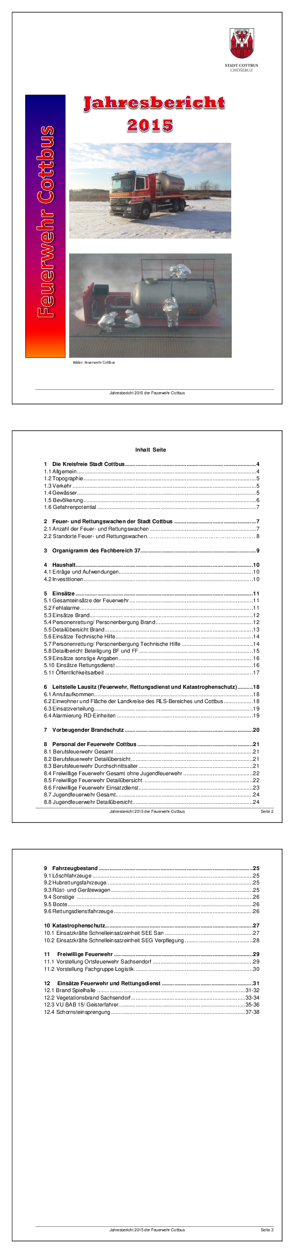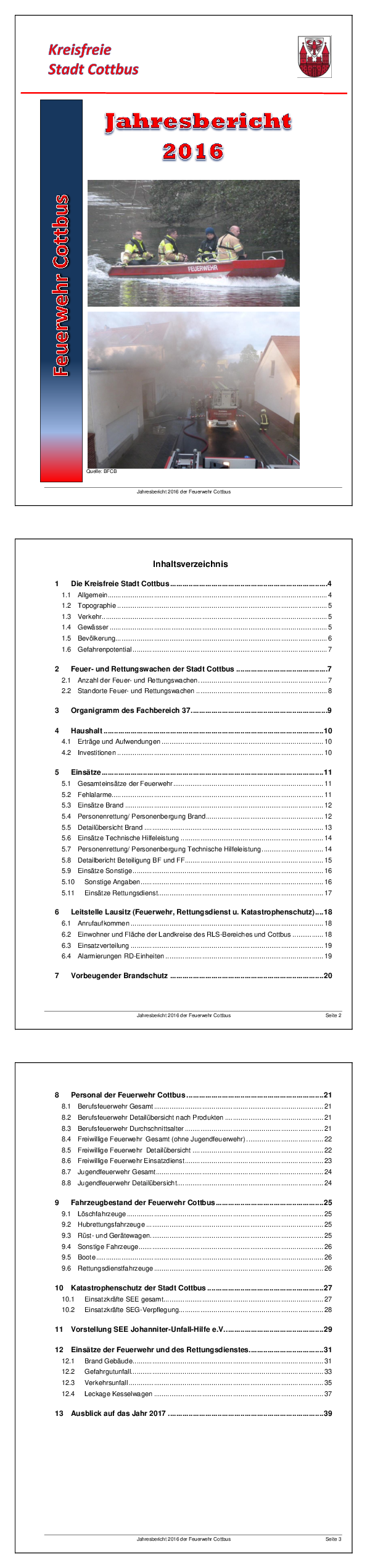 Wir stellen Ihnen hier aktuelle Dokumente zum Download zur Verfügung, die Sie über die Arbeit der Berufs- und der freiwilligen Feuerwehren Cottbus informieren: