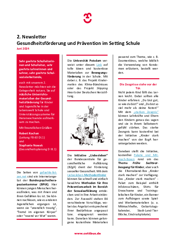 die Schulzeit ist eine prägende Lebensphase für alle jungen Heranwachsenden. In dieser Zeit entwickeln die Jugendlichen ihre eigene Identität und treffen zunehmend eigenständige Entscheidungen, die ihr weiteres Leben mitbestimmen. Auch das dann erworbene Gesundheitsverhalten wirkt sich darauf aus. In Anbetracht von ständig neuen Internet-Trends oder dem zunehmenden Einfluss von Influencern möchten wir Sie in Ihrer Arbeit in den Schulen besonders hinsichtlich der Vermittlung von gesundheitsfördernden Themen und der Prävention unterstützen. Darum veröffentlichen wir in regelmäßigen Abständen einen Newsletter für schulrelevante Themen. In diesem finden Sie praktische Tipps, aktuelle Angebote und Hinweise auf weiterführende Informationen oder Begleitmaterial, die den Schulalltag bereichern können. Auf dieser Seite veröffentlichen wir sowohl den aktuellen als auch die vergangenen Newsletter zum Herunterladen. Schauen Sie gerne regelmäßig vorbei.