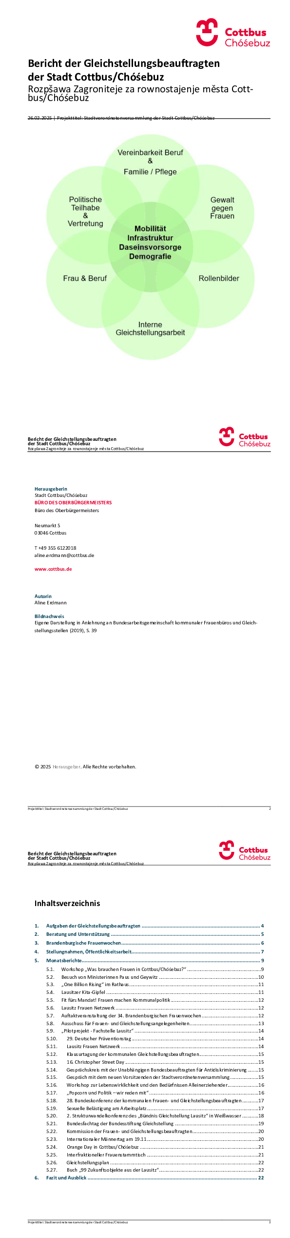 Extern wirken sie auf der Grundlage des § 18 der Kommunalverfassung des Landes Brandenburg in die Kommune hinein, nehmen Einfluss auf die kommunalpolitische Entwicklung und die Willensbildung der politischen Gremien, beraten und nehmen Stellung zu frauen- und gleichstellungsrelevanten Aspekten bei Vorhaben in der Kommune.