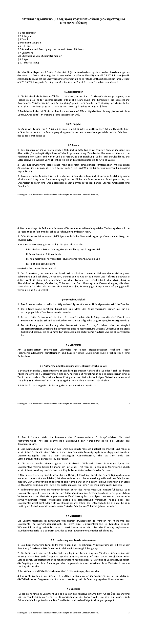 SATZUNG DER MUSIKSCHULE DER STADT COTTBUS-CHÓŚEZ (KONSERVATORIUM COTTBUS-CHÓŚEBUZ)